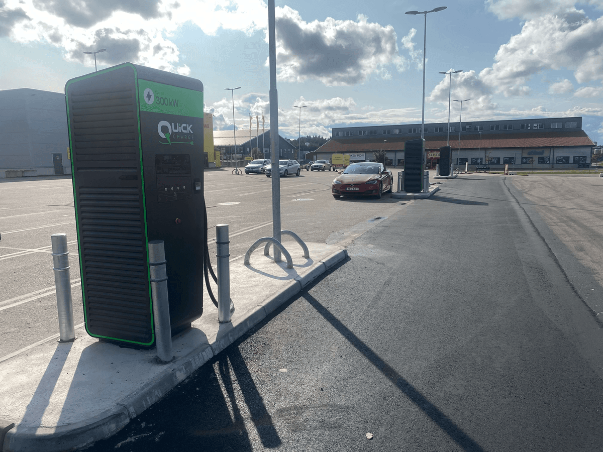 Quickcharge-laddarna är ultrasnabba, de laddar upp till 300 kW. Då kan man teoretiskt ladda en normalstorbil fullständigt på omkring 20-25 minuter. Passa på att ta en kopp kaffe, något att äta eller strosa runt i närliggande butiker.